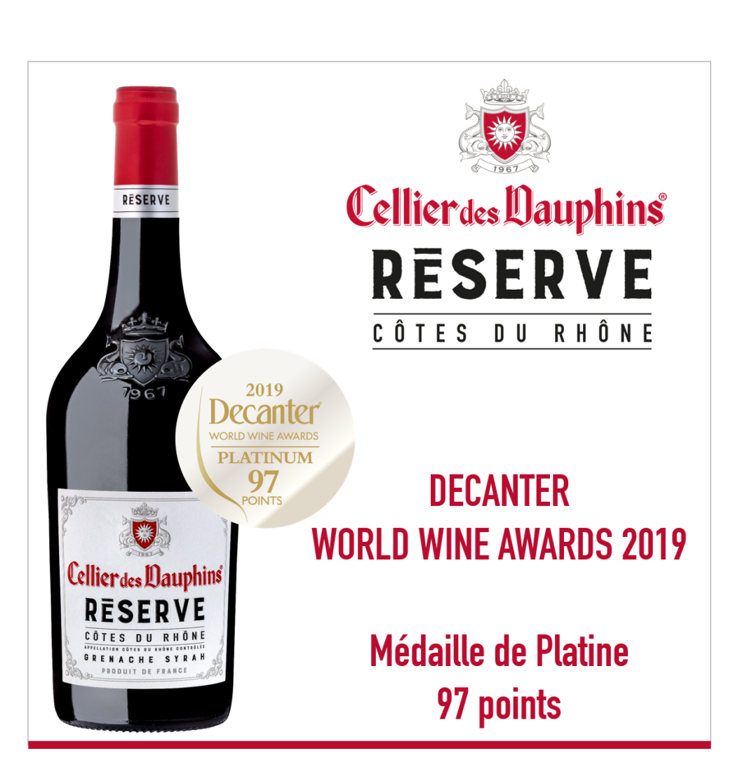 Cellier des Dauphins Réserve Rouge Côtes du Rhône se voit attribuer l’exceptionnelle Médaille de Platine avec la note de 97 points/100 lors de la 16ème édition du Decanter World Wine Awards. Prestigieux et respecté internationalement, Decanter est le concours de dégustation qui rassemble près de 17 000 vins de 57 pays jugés par un parterre d’experts composé de Master of Wine et Master Sommelier.